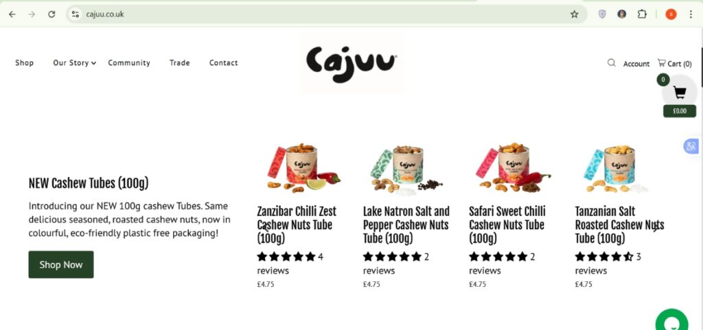We successfully developed a clean, user-friendly, and high-performing Shopify store for CAJUU UK, a premium brand specializing in ethically sourced cashew nuts and healthy snacks. The project’s main objective was to create a digital storefront that reflects CAJUU’s sustainability values, modern brand identity, and commitment to quality. Our team focused on elegant design, smooth navigation, and optimized functionality to enhance user experience and boost online conversions